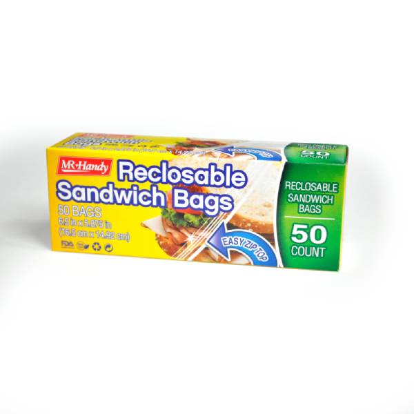 Caja con 50 bolsas reutilizables de cierre fácil.