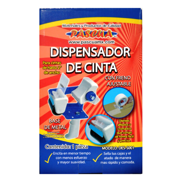 Despachador de cinta modelo DES-S001, para cintas de hasta 2" de ancho con freno ajustable, favor de seleccionar de la lista desplegable el color de su preferencia en base a las fotografías, en caso contrario se le mandará de aquel que tengamos existencia.