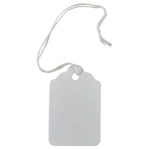 Etiqueta colgante color blanco, mide 4.3 cm x 2.7 cm.