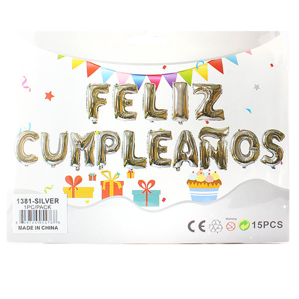 Globo con las letras "FELIZ CUMPLEAÑOS" en color plata de 16"