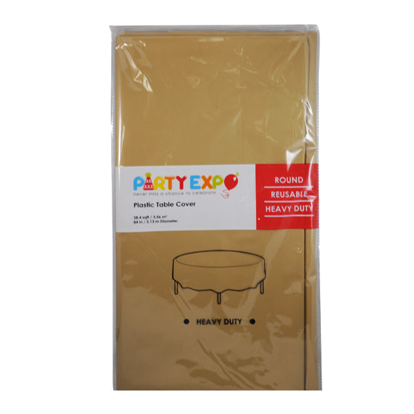 Mantel de plástico liso color dorado, forma redonda, mide 2.15 mts