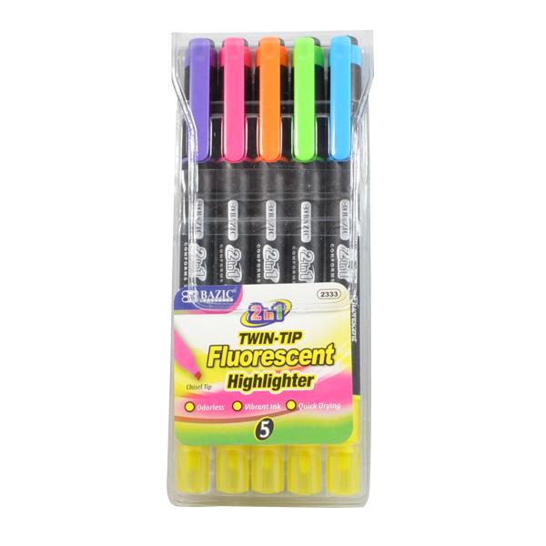 Paquete con 5 marcatextos de punta doble, la punta de abajo es color amarillo