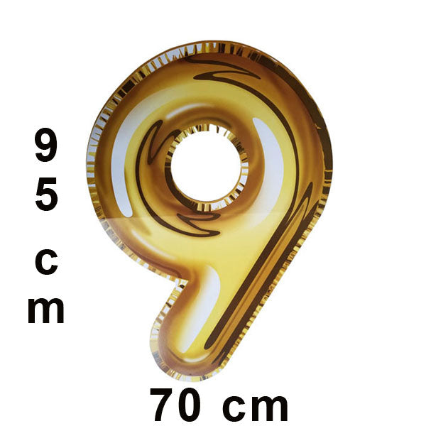 Número 9 de cartón color oro tipo globo, mide 95 cm x 70 cm